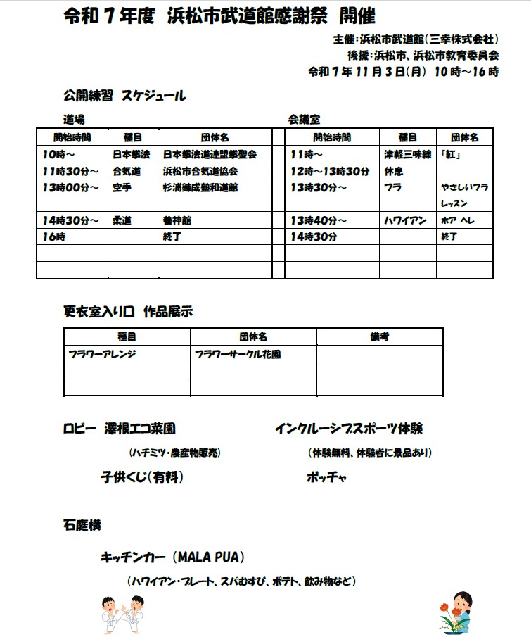 明後日開催の浜松市武道館の感謝祭ですが、当日のプログラムとタイムスケジュールが